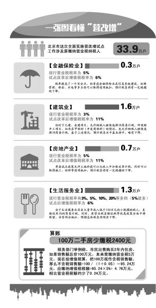 據(jù)介紹,這次全面推開營改增試點,本市共涉及建筑業(yè)、房地產業(yè)、金融業(yè)、生活服務業(yè)等約33.9萬營業(yè)稅納稅人,該部分納稅人2015年繳納營業(yè)稅合計1336.9億元。經(jīng)初步測算,全面推開營改增試點后,本市每年將新增減稅420.2億元,其中地方財政負擔264億元。不過,由于今年是自5月1日才開始擴圍改革,北京地方財政年內將只因此減稅約154億元。