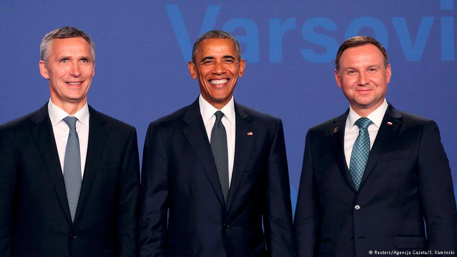 北約秘書長斯托爾滕貝格(左)與奧巴馬、波蘭總統(tǒng)杜達(dá)(右)。從華約的前線變成北約的前線,不知道波蘭領(lǐng)導(dǎo)人心中是何滋味?