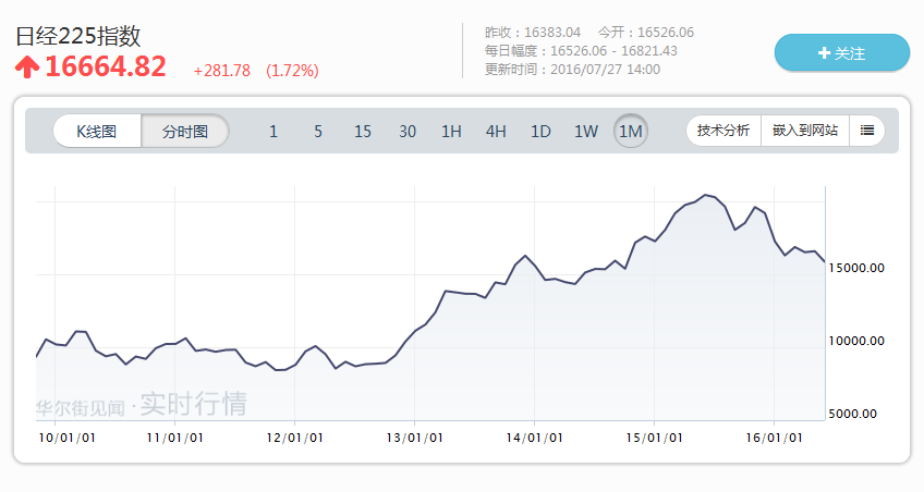 在安倍實行超級寬松的經(jīng)濟(jì)政策之后,日本股市一度高漲,表現(xiàn)喜人,但從2015年11月開始,日股開始一路走低。