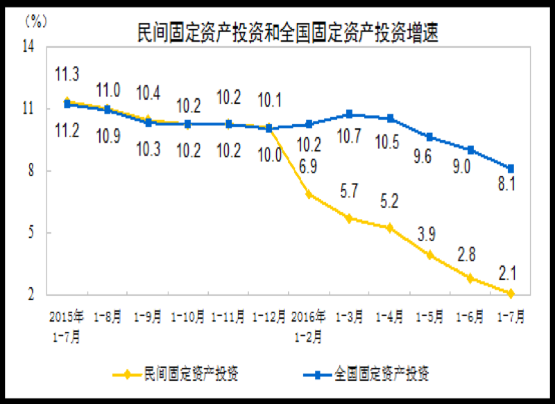 “新常態(tài)”進(jìn)入2016年,一個(gè)新現(xiàn)象引發(fā)社會(huì)高度關(guān)注,國(guó)務(wù)院也緊急成立調(diào)查組進(jìn)行調(diào)研:民間投資增速急劇放緩。在2015年,民間投資與全社會(huì)投資增速高度擬合,然而自2016年初開(kāi)始兩者拉開(kāi)差距且呈逐步擴(kuò)大趨勢(shì)。1-7月民間投資增速2.1%,遠(yuǎn)低于全社會(huì)投資增速8.1%。民間投資與非民間投資的“背離”之所以值得關(guān)注,是因?yàn)椋旱谝?,民企貢獻(xiàn)了60%以上的GDP;第二,政府和國(guó)企的投資不能真實(shí)反應(yīng)經(jīng)濟(jì)“情緒”,只有民間投資才是最可靠的“信心指標(biāo)”。