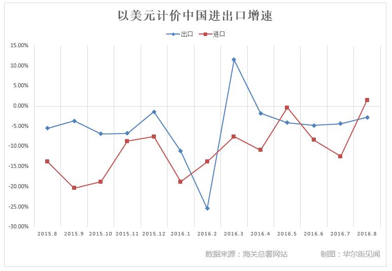 以人民幣計價,8月進(jìn)口9250億元,同比大幅增長10.8%,好于預(yù)期的0.7%,和上月的-5.7%。以美元計稍差,8月進(jìn)口同比增1.5%,但也為2014年11月以來首次轉(zhuǎn)為正值。大幅好于預(yù)期的下滑5.4%,7月為下滑12.5%。