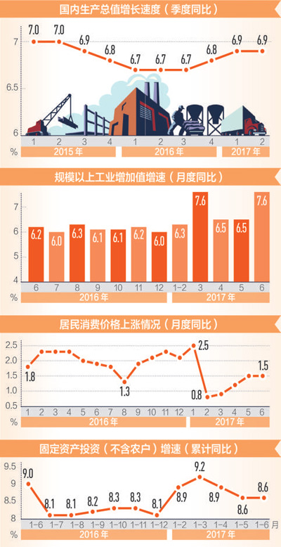 經(jīng)濟(jì)增速保持平穩(wěn)。上半年我國經(jīng)濟(jì)保持中高速增長,GDP同比增長6.9%,與一季度持平,經(jīng)濟(jì)增速連續(xù)8個(gè)季度保持在6.7%—6.9%的區(qū)間。
