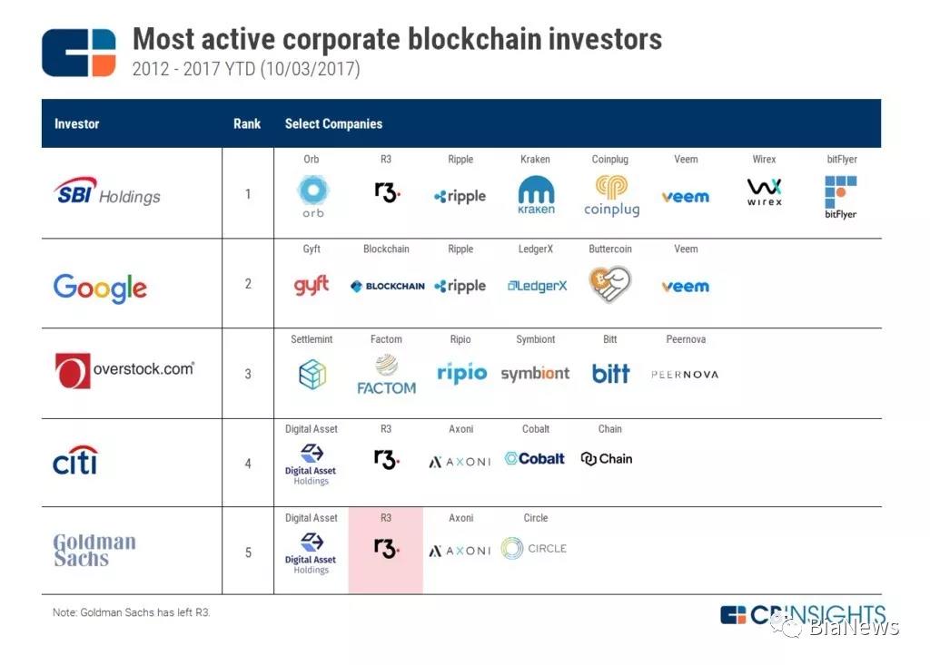 報告顯示,總部位于日本的SBI Holdings是最大的企業(yè)投資者,投資于8家獨特的區(qū)塊鏈公司。谷歌以6項排名第二。