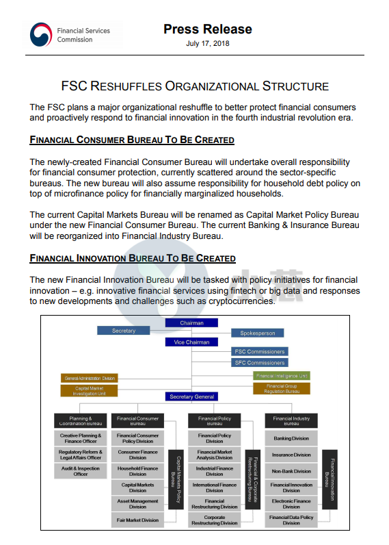 據(jù)韓國金融服務(wù)委員會(FSC)官方文件,F(xiàn)SC已于7月17日成立了一個(gè)專門針對該國加密貨幣行業(yè)的部門—金融創(chuàng)新局,旨在制定加密貨幣政策并助力金融科技行業(yè)。據(jù)Ethnews,業(yè)內(nèi)人士猜測此舉或暗示韓國準(zhǔn)備接受加密貨幣和區(qū)塊鏈技術(shù)。