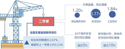 中國國土勘測規(guī)劃院日前發(fā)布的全國主要城市地價(jià)監(jiān)測報(bào)告顯示,二季度全國總體地價(jià)增速微漲。全國主要監(jiān)測城市地價(jià)較去年同期增長2.67%,增速較上一季度上升0.23%。