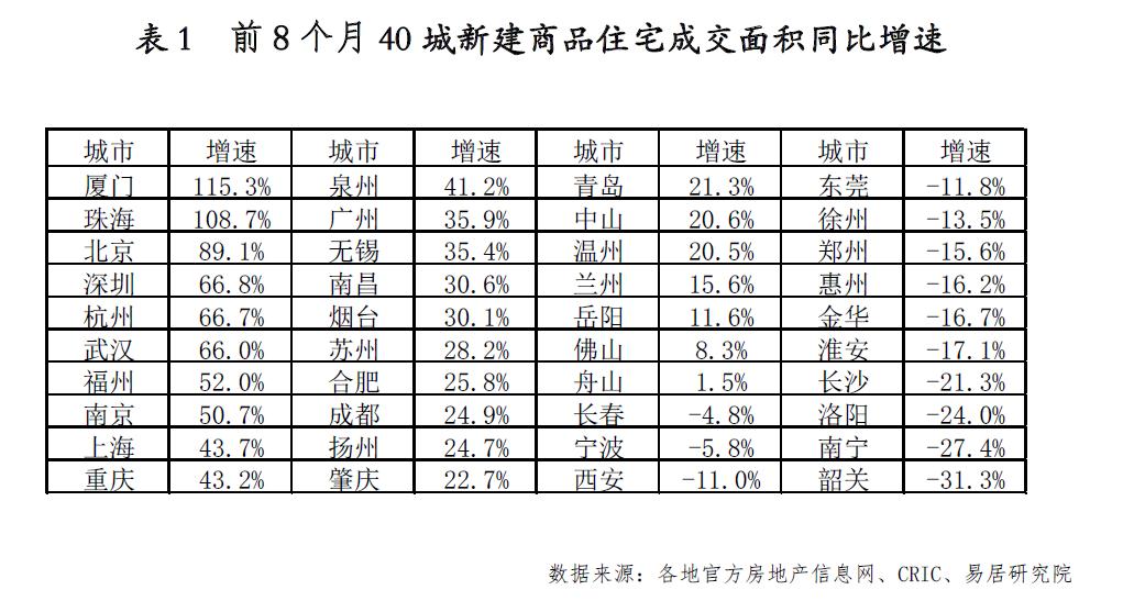 從城市來看,前8個月,40城新建商品住宅成交面積同比增速排名前十的城市依次為:廈門、珠海、北京、深圳、杭州、武漢、福州、南京、上海、重慶。