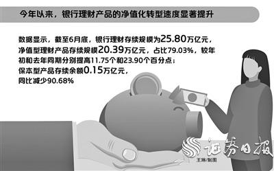 今年以來,銀行理財(cái)產(chǎn)品的凈值化轉(zhuǎn)型速度顯著提升。銀行業(yè)理財(cái)?shù)怯浲泄苤行陌l(fā)布《中國銀行業(yè)理財(cái)市場半年報(bào)告(2021年上)》報(bào)告顯示,截至6月底,銀行理財(cái)存續(xù)規(guī)模為25.80萬億元,凈值型理財(cái)產(chǎn)品存續(xù)規(guī)模20.39萬億元,占比79.03%,較年初和去年同期分別提高11.75個(gè)和23.90個(gè)百分點(diǎn);保本型產(chǎn)品存續(xù)余額0.15萬億元,同比減少90.68%。