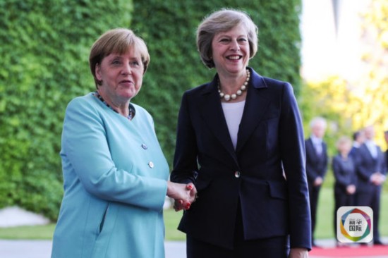 7月20日,在德國(guó)柏林,德國(guó)總理默克爾(左)與英國(guó)首相特雷莎·梅在歡迎儀式上握手。 (新華社記者郭洋攝)
