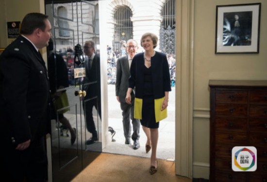 7月13日,在英國(guó)倫敦,英國(guó)新首相特雷莎·梅(右)與丈夫菲利普·約翰·梅走入唐寧街10號(hào)首相府。 (新華社/美聯(lián))
