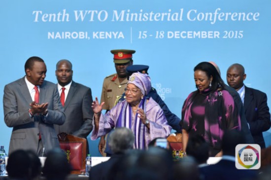 2015年12月16日,在肯尼亞內(nèi)羅畢,利比里亞總統(tǒng)埃倫·約翰遜-瑟利夫(中)在一場(chǎng)會(huì)議上向與會(huì)者致意。(新華社記者孫瑞博攝)