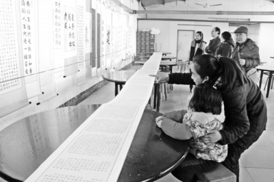 在展覽現(xiàn)場,上至八九十歲的老人,下至四五歲的孩童,全都認(rèn)真仔細(xì)觀看,尤其是看到劉天一老師用小楷書寫的35米優(yōu)秀傳統(tǒng)文化長卷時,大家都感覺非常震撼。大成集村70多歲的村民吳樹人激動地說:“看看這長卷,就知道劉老師下了多大功夫。你看,這每一節(jié)的布局,每個字的書寫,都是規(guī)規(guī)矩矩、有板有勢,這是對下一輩無言的教育啊!”