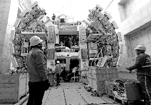 北京晨報(bào)記者在現(xiàn)場(chǎng)看到,各種吊車(chē)、大型作業(yè)機(jī)器正在緊張作業(yè)中。記者走到隧道“洞口”處看到, 腳下一臺(tái)巨型的盾構(gòu)機(jī)呈現(xiàn)在眼前,由于隧道采用明挖法、暗挖法、盾構(gòu)法相結(jié)合的施工作業(yè)方法,據(jù)記者目測(cè),從盾構(gòu)機(jī)最底端到記者所在的地面約有七八層樓高。幾十名施工人員正冒著寒風(fēng)對(duì)盾構(gòu)機(jī)進(jìn)行組裝、吊裝。北京晨報(bào)記者了解到,這臺(tái)巨型盾構(gòu)機(jī)直徑達(dá)11米左右。