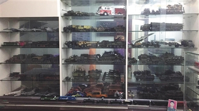 于萌家中收藏的一些軍事模型。其表示,自己是個“軍迷”,于十年前買了仿真槍用于收藏,沒想到被鑒定為真槍,更沒想到會觸犯法律。受訪者供圖