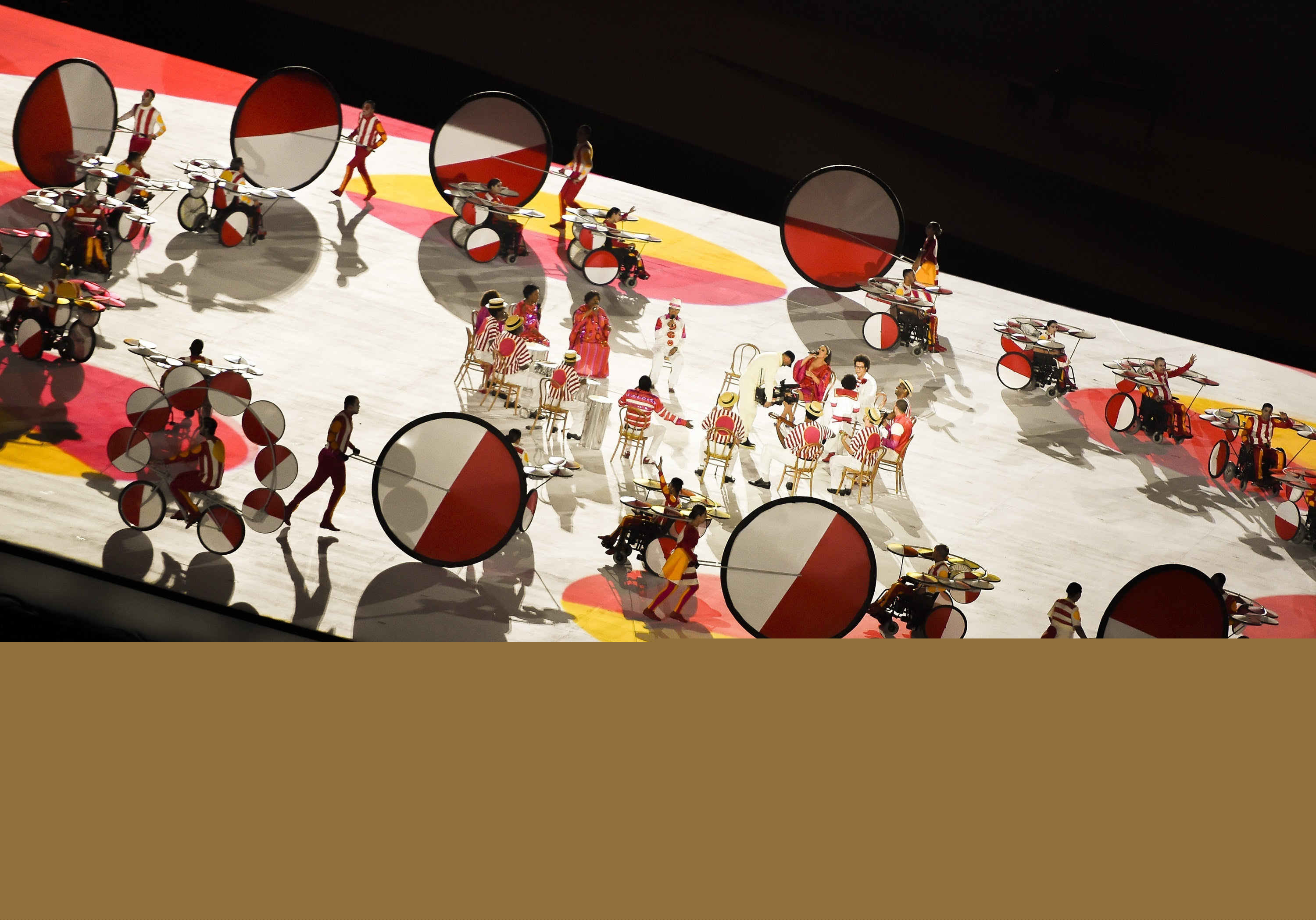 在投影配合下,整個(gè)舞臺(tái)似乎都旋轉(zhuǎn)起來(lái),觀眾可以看到巨大的齒輪和引擎的轉(zhuǎn)動(dòng)。與此同時(shí),紅白兩色的巨大車輪、輪椅和輪椅自行車來(lái)到舞臺(tái),上演了“車輪大游行”。而當(dāng)一曲終了,一切歸于原點(diǎn),代表著桑巴未來(lái)的小男孩佩德里尼奧再次為世人奉上手鼓獨(dú)奏。