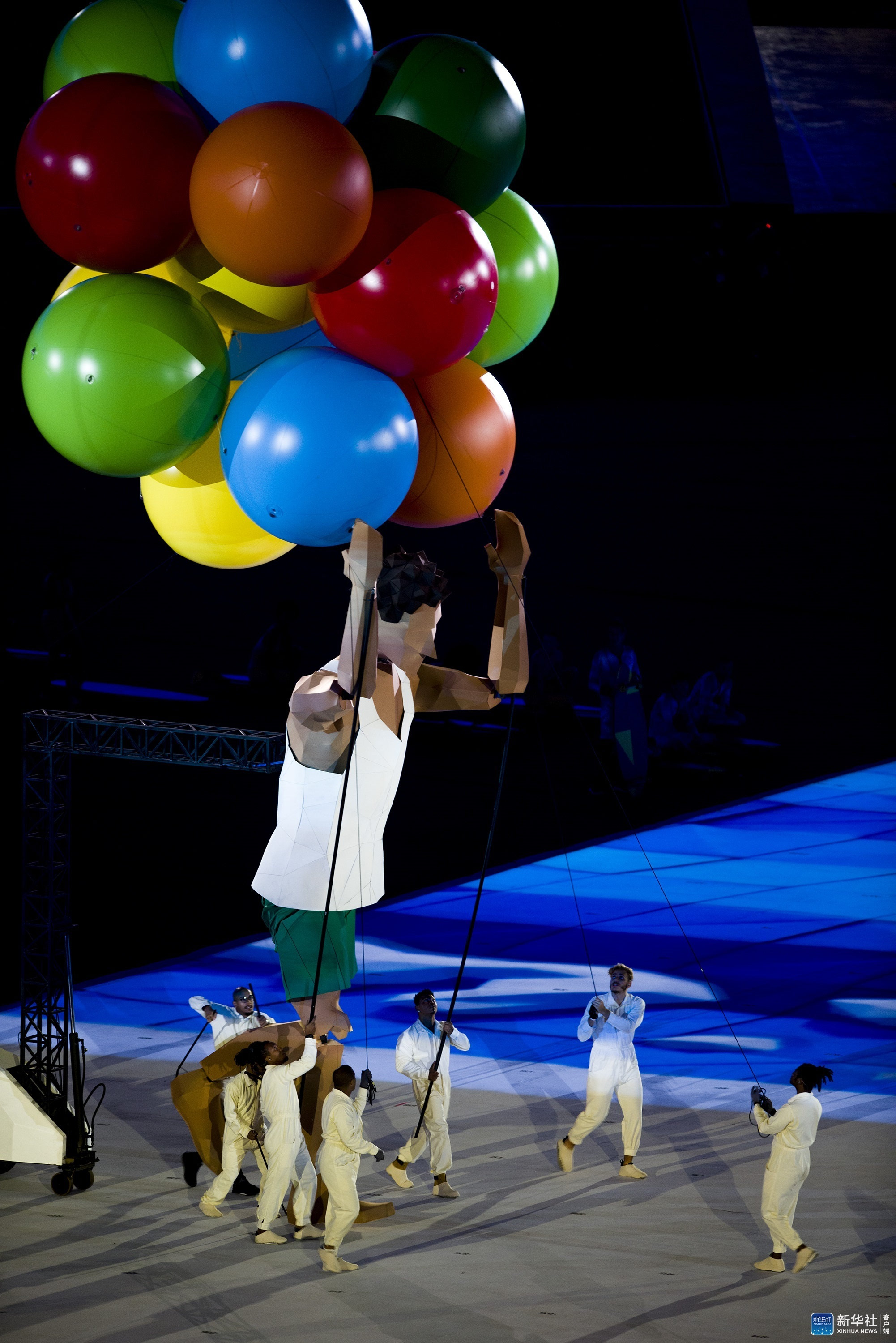 每個(gè)代表團(tuán)前面有一個(gè)手舉拼圖的引導(dǎo)員,拼圖一面是國(guó)家名字,而另一面則是參賽運(yùn)動(dòng)員的照片。待東道主巴西代表團(tuán)入場(chǎng)之后,拼圖的最后一塊完成。全部參賽運(yùn)動(dòng)員的照片,在舞臺(tái)中央拼成一顆心。燈光熄滅,紅心閃亮,全場(chǎng)觀眾一起感受心跳的聲音。這時(shí)候,心生出了色彩斑斕的花草魚蟲,突破了邊界,創(chuàng)造出新生。