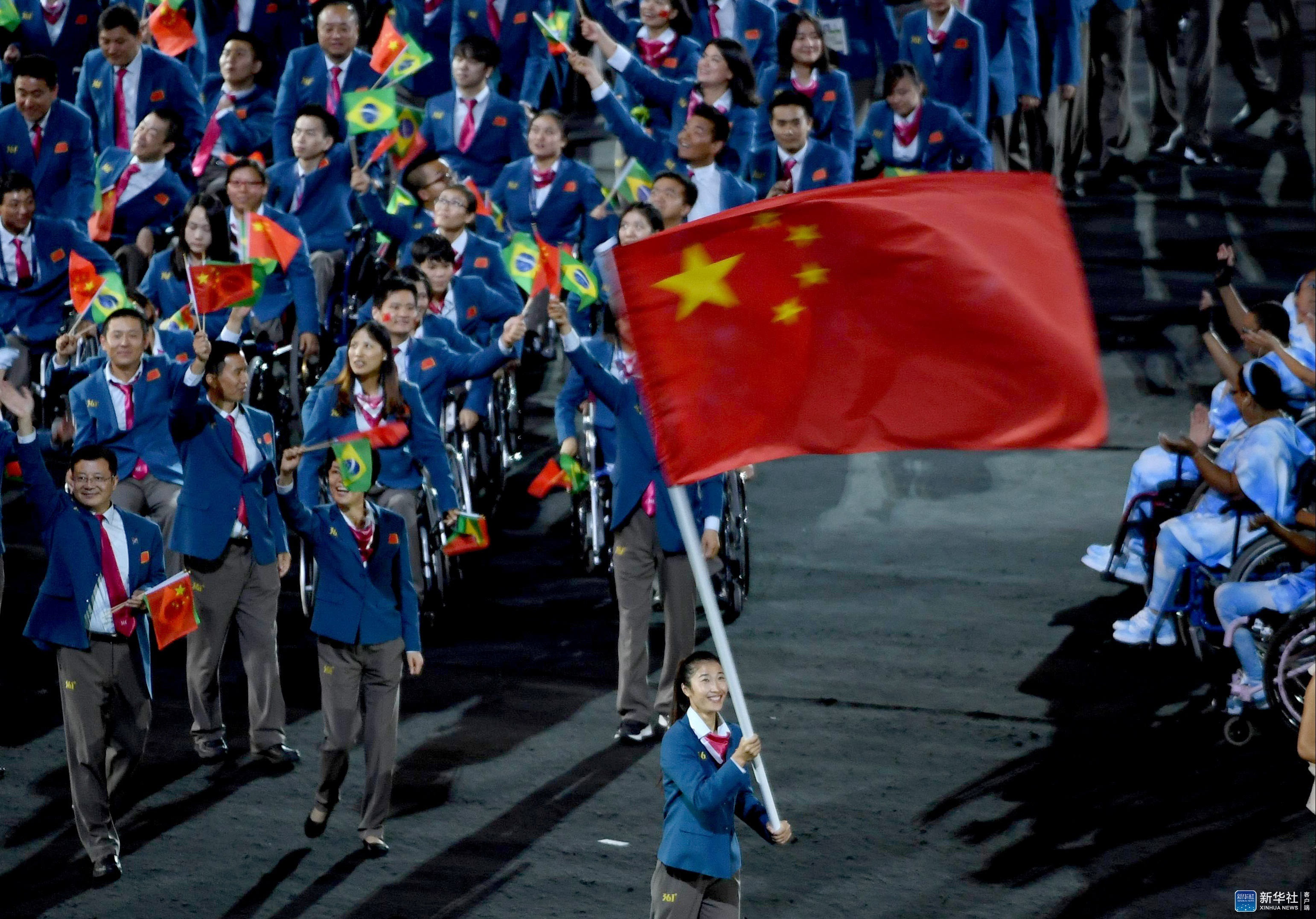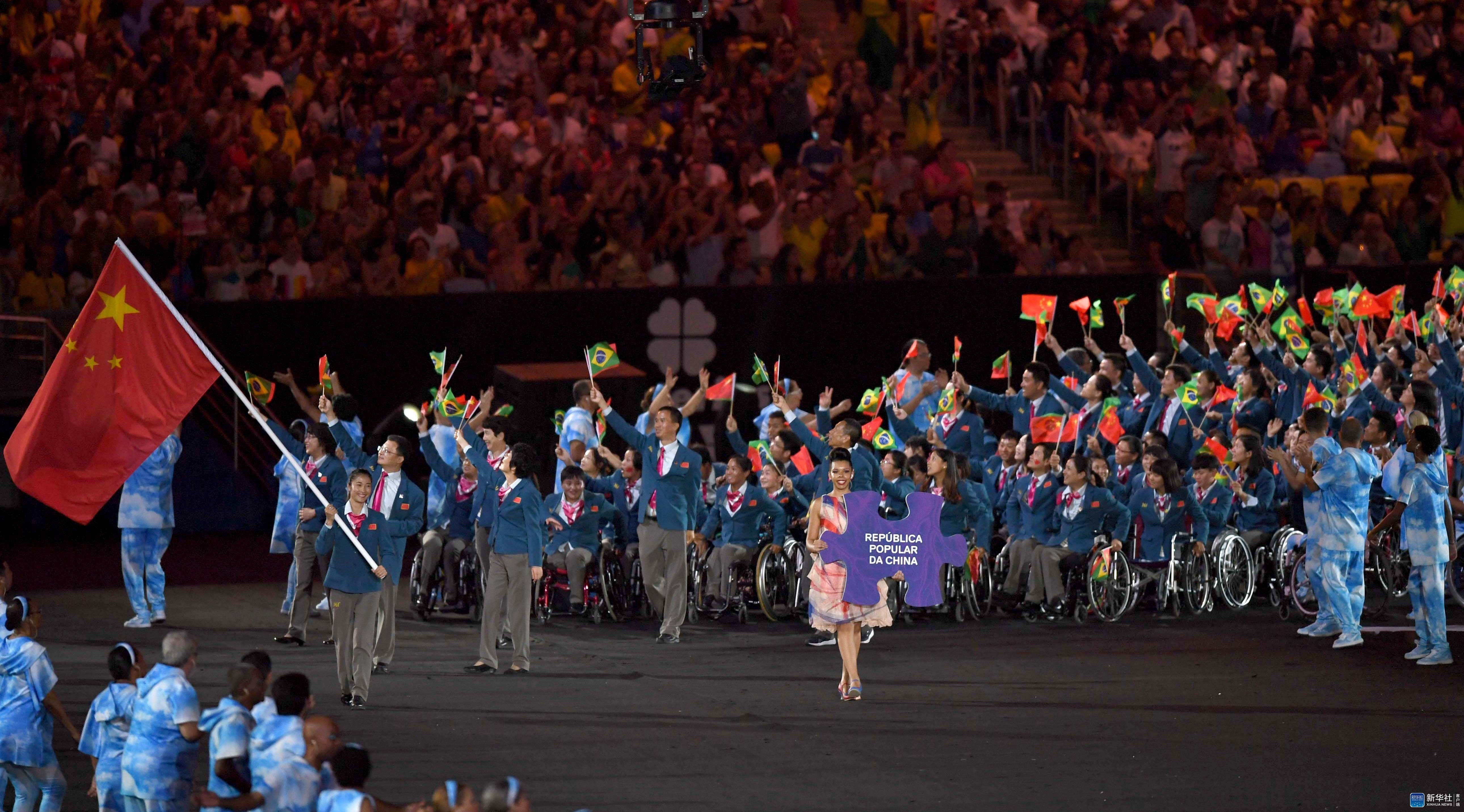 輪椅擊劍運(yùn)動(dòng)員榮靜高擎五星紅旗引領(lǐng)中國(guó)隊(duì)入場(chǎng),本屆賽事中國(guó)代表團(tuán)有307名運(yùn)動(dòng)員,是參賽人數(shù)最多的代表團(tuán),也是中國(guó)參加在境外舉行的殘奧會(huì)運(yùn)動(dòng)員人數(shù)最多、參賽項(xiàng)目最多、代表團(tuán)規(guī)模最大的一次。