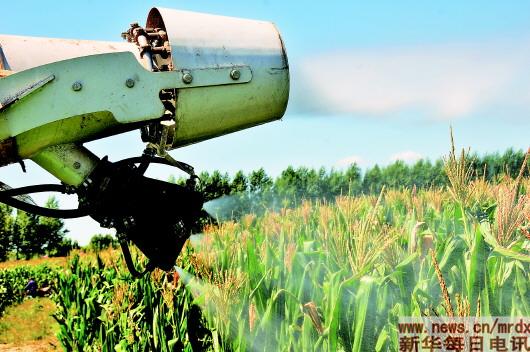 ▲在黑龍江省肇東市明久鄉(xiāng),一輛風(fēng)送式高效遠程噴霧機在玉米地里噴灑滅蟲藥。新華社記者王凱攝