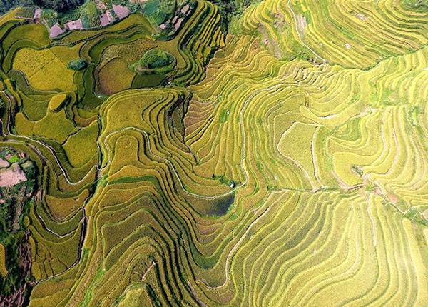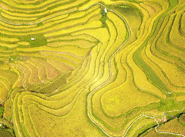 秋天來臨,位于貴州省黔東南苗族侗族自治州的月亮山梯田水稻成熟,為大地披上金裝。