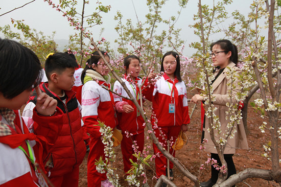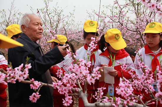 4月10日,山東省平邑縣地方鎮(zhèn)金池完小的學生在桃園里聽農(nóng)技人員講解桃樹開花結果過程。