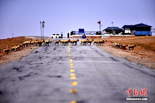 可可西里2017年首批藏羚羊安全通過青藏公路。中新社記者 孫燕初 攝