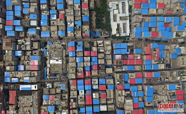 8月24日,河南鄭州市的最大城中村陳寨即將開拆。從空中看陳寨,樓房櫛比鱗次,大部分樓房房頂,全部是藍(lán)色或紅色的彩鋼瓦。