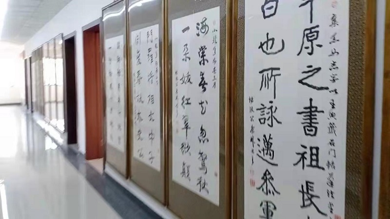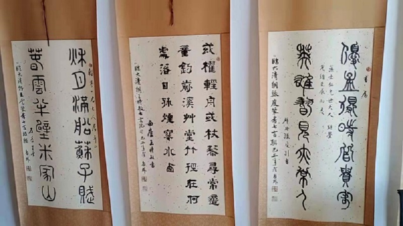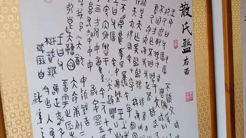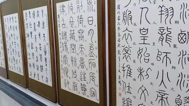 踏進(jìn)魯林工作室大樓,筆者被眼前的景象震撼了。從寬敞的樓梯間,到樓上樓下再到幾十米的長(zhǎng)廊,上下左右隨處可見懸掛滿墻的各種字體書法作品,竟然全部是魯林親手所寫。其中,除了一些我們很容易就能辨認(rèn)的行楷隸篆外,還有大量別人很少涉及的金文、甲骨文、象形文字等,再看陳列在另外的五六間大展室內(nèi)的作品,有大量風(fēng)格各異的詩詞、佳句及臨摹名家字跡的成套佳作,更是數(shù)不勝數(shù)。這真可謂就是一個(gè)大型的“百家”書法精品展覽館。
