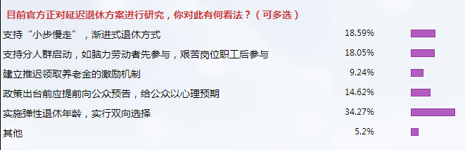 網(wǎng)友如何看待延遲退休問題?在“目前官方正對延遲退休方案進(jìn)行研究,你對此有何看法?”的調(diào)查中,選擇“支持‘小步慢走’、漸進(jìn)式退休方式”的網(wǎng)友為 18.59%;選擇“支持分人群啟動,如腦力勞動者先參與,艱苦崗位職工后參與”的網(wǎng)友為18.05%;此外,還有9.24%的網(wǎng)友選擇“建立推遲領(lǐng)取養(yǎng)老金的激勵機(jī)制”;14.62%的網(wǎng)友選擇“政策出臺前應(yīng)提前向公眾預(yù)告,給公眾以心理預(yù)期”;34.27%的網(wǎng)友選擇了“實(shí)施彈性退休年齡,實(shí)行雙向選擇”。