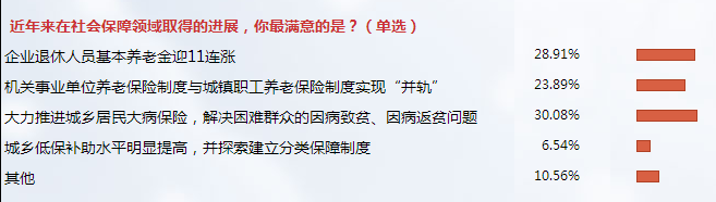 網(wǎng)友對我國近來在社會保障領(lǐng)域取得的各項(xiàng)進(jìn)展如何看待?在“近年來在社會保障領(lǐng)域取得的進(jìn)展,你最滿意的是?”的調(diào)查中,選擇“企業(yè)退休人員基本養(yǎng)老金迎 11連漲”的占投票數(shù)的28.91%;選擇“機(jī)關(guān)事業(yè)單位養(yǎng)老保險制度與城鎮(zhèn)職工養(yǎng)老保險制度實(shí)現(xiàn)"并軌"”的占23.89%;選擇“大力推進(jìn)城鄉(xiāng)居民大病保險,解決困難群眾的因病致貧、因病返貧問題”的占30.08%;此外,選擇“城鄉(xiāng)低保補(bǔ)助水平明顯提高,并探索建立分類保障制度”的占6.54%;還有10.56%的網(wǎng)友在選項(xiàng)了“其他”。