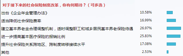 在“對于接下來的社會保險制度改革,你有何期待?”的調(diào)查中,“出臺《企業(yè)年金管理辦法》”(10.58%)、“適當(dāng)降低社會保險費(fèi)率” (16.99%)、“建立基本養(yǎng)老金合理調(diào)整機(jī)制,適時調(diào)整職工和城鄉(xiāng)居民基本養(yǎng)老保險待遇”(26.97%)、“進(jìn)一步提高基本醫(yī)療保險的報(bào)銷比例” (25.83%)以及“提升社會保險關(guān)系跨地區(qū)、跨制度轉(zhuǎn)移接續(xù)水平”(17.08%)獲選前五位。