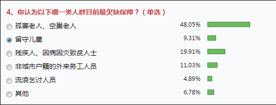 在“你認(rèn)為以下哪一類人群目前最欠缺保障”的調(diào)查中,選擇“孤寡老人、空巢老人”的網(wǎng)友比例為48.05%;選“留守兒童”的有9.31%;選擇“殘疾人、因病因?yàn)?zāi)致貧人士”的有19.91%;而其余的選項(xiàng),“非城市戶籍的外來務(wù)工人員”占11.03%,“流浪乞討人員”占4.89%。此外,還有 6.78%的網(wǎng)友選擇了“其他”。