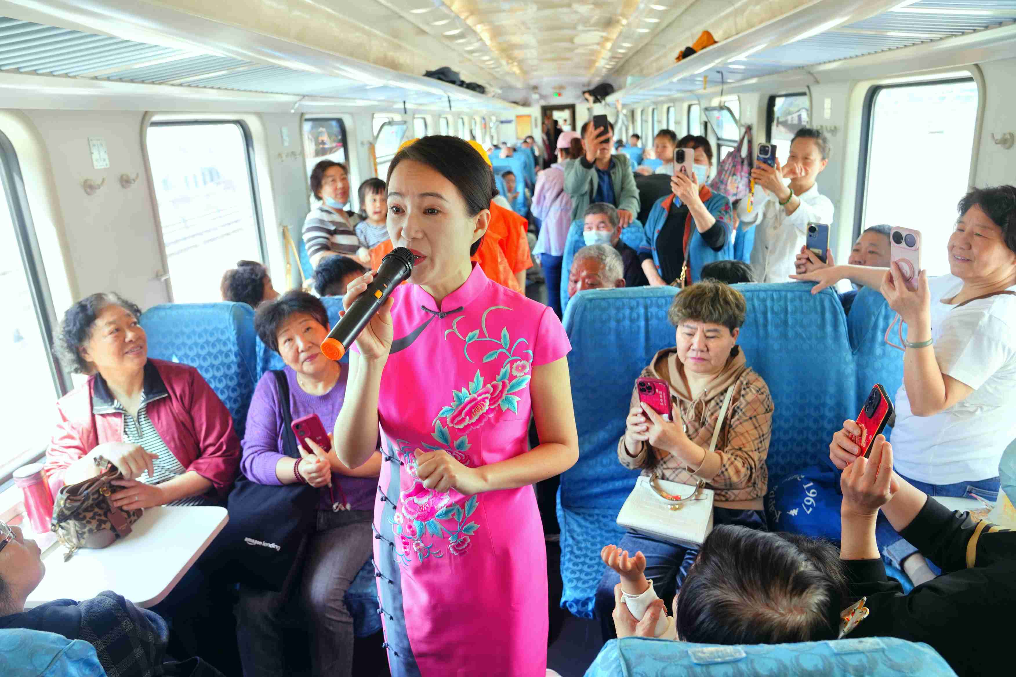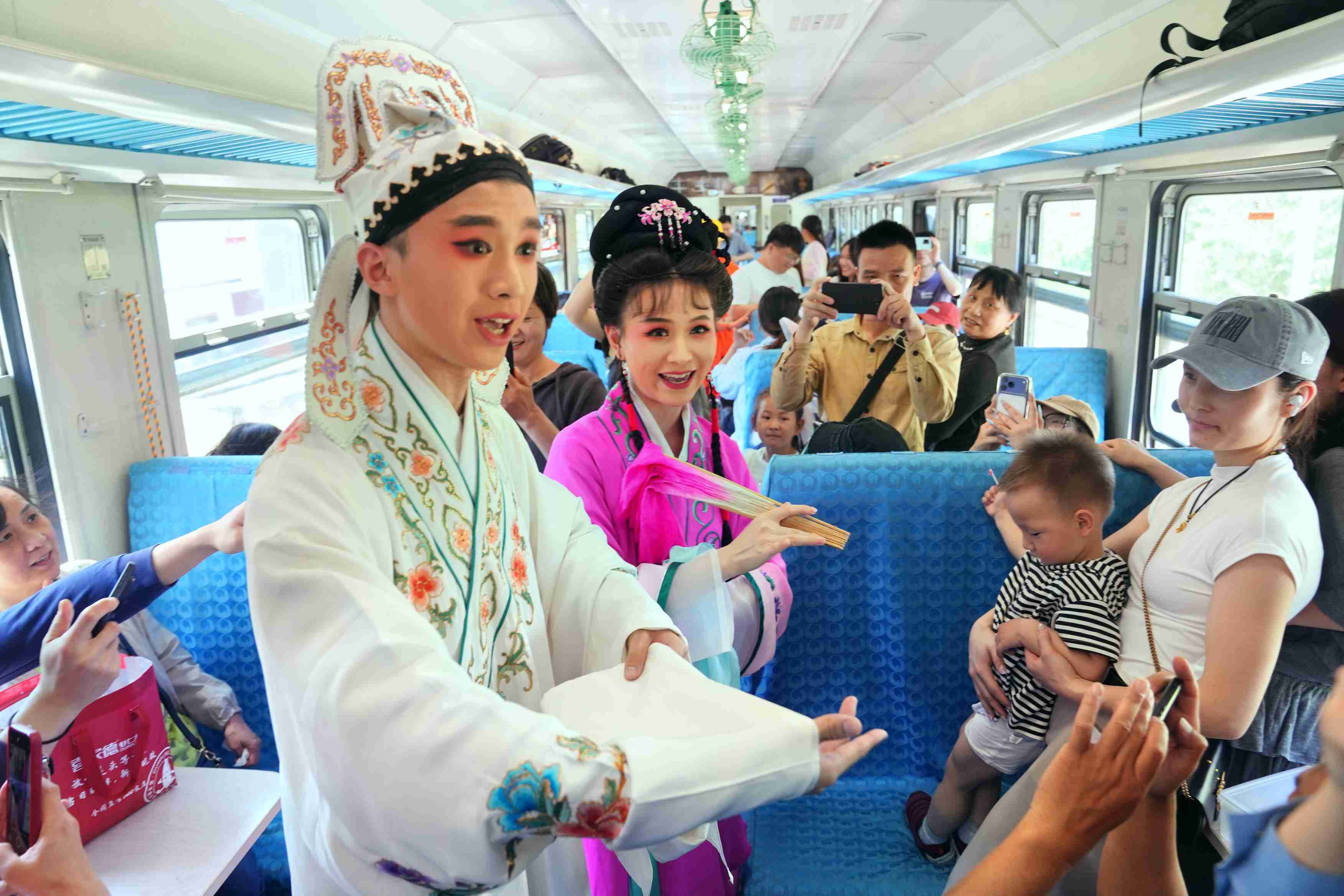 環(huán)線列車飛馳,文化相伴出行。42名演職人員分為3隊,登乘“武昌至武昌”5856次普速環(huán)線列車,逐節(jié)車廂表演節(jié)目。窗外風光與車廂藝韻交相輝映,藝術家們帶著“壓箱底”的絕活兒走進車廂,旅客們也紛紛拿出手機定格旅途美好瞬間。