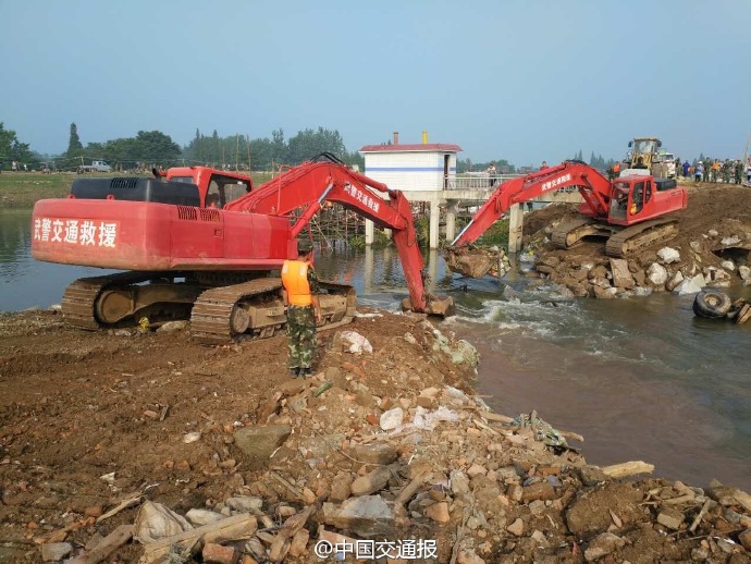 截至10日晚9時(shí),約2.36萬人已被轉(zhuǎn)移。在搶險(xiǎn)救援中,身系安全繩的搶險(xiǎn)人員駕駛著載滿麻石的卡車駛向潰口,在卡車墜入潰口前跳下卡車,用連車帶石的方式封堵潰口。