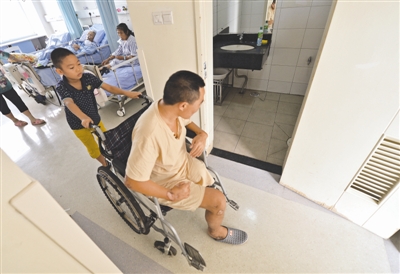 昨日中午,成都商報(bào)記者在川大華西醫(yī)院中西醫(yī)結(jié)合科病房見到了伍國材一家,坐在輪椅上的爸爸伍宏左腿截肢,而生病的奶奶剛輸完上午的藥,側(cè)坐在凳子上。