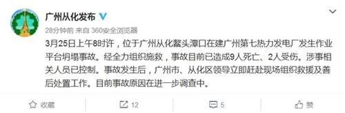 中新網(wǎng)3月25日電 據(jù)廣州市從化新聞網(wǎng)絡(luò)管理中心官方微博消息,3月25日上午8時(shí)許,位于廣州從化鰲頭潭口在建廣州第七熱力發(fā)電廠發(fā)生作業(yè)平臺坍塌事故。經(jīng)全力組織施救,事故目前已造成9人死亡、2人受傷。涉事相關(guān)人員已控制。事故發(fā)生后,廣州市、從化區(qū)領(lǐng)導(dǎo)立即趕赴現(xiàn)場組織救援及善后處置工作。