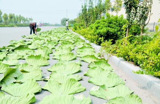 在李莊村通往谷亭街道的鄉(xiāng)村小道上,家家戶戶房前屋后都曬滿了荷葉?!耙惶旆淮?平時(shí)也不耽誤干其他農(nóng)活,這錢賺得省心?!鼻皝矸~子的李大爺高興地說。
