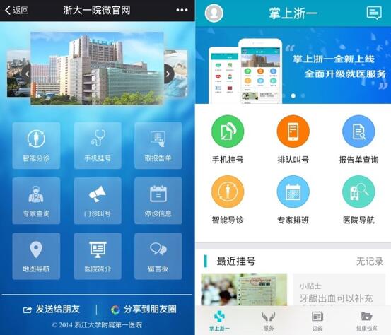 圖為浙大一院微官網(wǎng)截圖、“掌上浙一”APP截圖