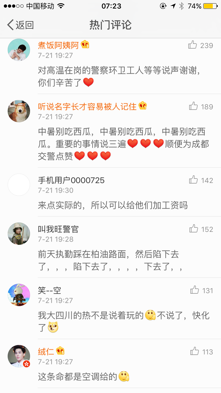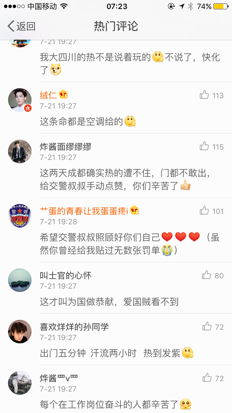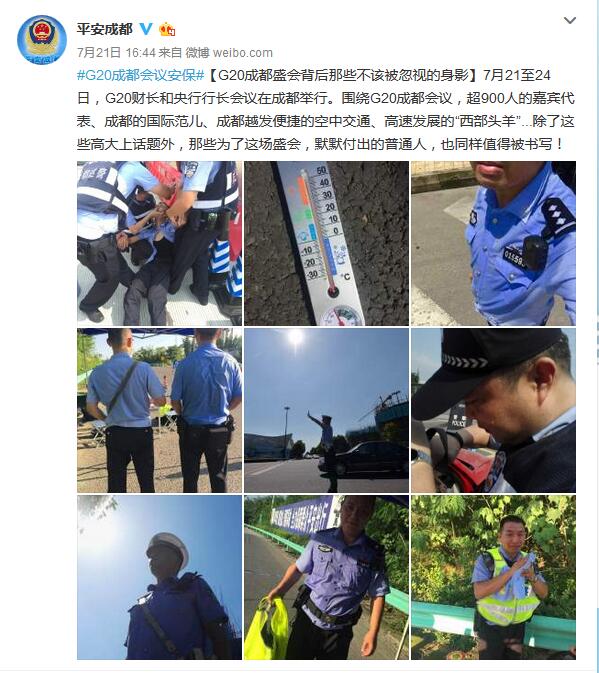 隨后,@平安成都 又更新一條微博,配圖不僅有早前連長,還有更多奮斗在一線的執(zhí)勤警察照片,并配文稱:“7月21日至24日,G20財長和央行行長會議在成都舉行。圍繞G20成都會議,超900人的嘉賓代表、成都的國際范兒、成都越發(fā)便捷的空中交通、高速發(fā)展的‘西部頭羊’……除了這些高大上話題外,那些為了這場盛會,默默付出的普通人,也同樣值得被書寫!”