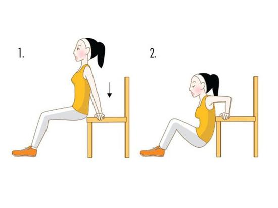 彎曲雙膝,臀部與椅面平行,雙手向后放在椅子上以支撐身體,慢慢用手臂的力量將臀部移向地面,再抬起至平行椅面,重復(fù)20次。