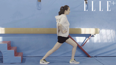單腿向前邁出半步,做屈膝的動作,另一條小腿保持拉伸感。
