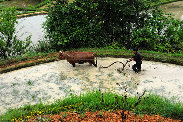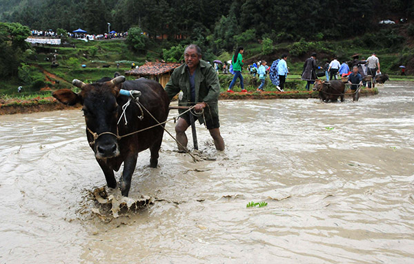 5月21日,在貴州省黎平縣尚重鎮(zhèn)洋洞村舉行的牛耕節(jié)上,洋洞村村民在犁地。