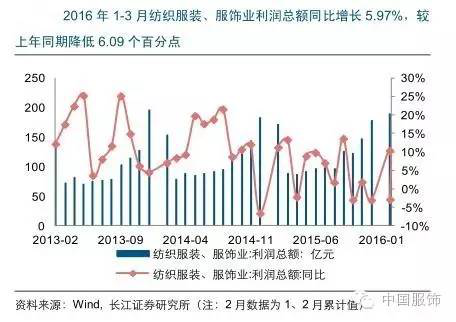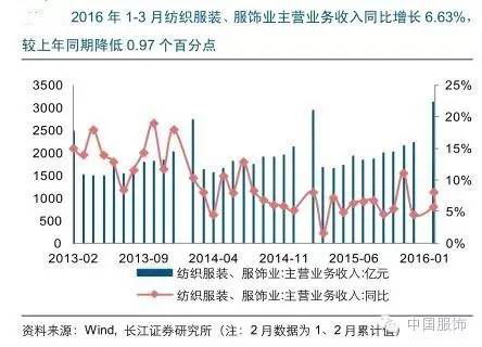 據(jù)獲得的數(shù)據(jù)顯示,2015年暨2016年一季度,我國居民服裝家紡產(chǎn)品消費整體增速繼續(xù)下滑、增勢趨緩;行業(yè)整體營收和利潤增速下行趨勢進一步延續(xù),但營利能力逐步改善,行業(yè)整體債務狀況顯著優(yōu)化、庫存去化效果顯著,固定資產(chǎn)投資完成額處于歷史較低增速。