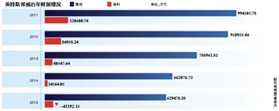 美邦盈利狀況每況愈下。2011年,美邦凈利為12.06億元,此后一路下跌,至2014年,凈利只有1.4564億元。2015年更是出現(xiàn)了4.3192億元的虧損。
