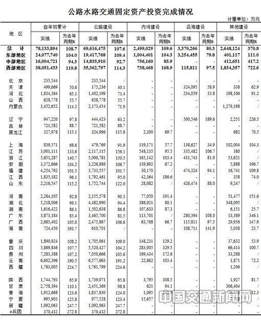 通報顯示,已統(tǒng)計的全國29個省市區(qū)公路水路交通固定資產(chǎn)投資實際完成7813.3894億元。西部地區(qū)完成情況較好,達3805.1433億元,為去年同期119.8%,東、中部地區(qū)分別為2407.7740億元、1600.4721億元,分別為去年同期的104%、94.3%。