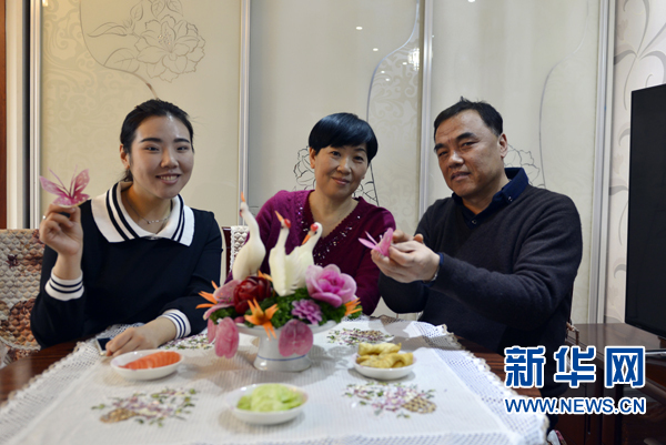 王晶終于能夠在繁忙的春運(yùn)中與父母坐在一起吃頓團(tuán)圓飯,同時也為母親過了一個簡單卻別出新意的生日。餐桌上擺的“祝壽仙鶴”,那是父親花了2個小時的時間用食材所雕刻。