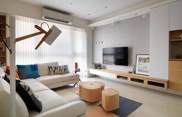 電視背景墻以灰色的乳膠漆刷至而成,客廳中放置著白色的轉(zhuǎn)角沙發(fā)配上五顏六色的靠墊以及大方塊的地毯,各種色彩的協(xié)調(diào)搭配,整體潔凈之中的大自然的味道以及寧靜之感。