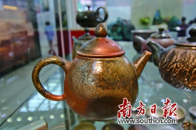 記者在現(xiàn)場近距離觀賞吳金維的作品,發(fā)現(xiàn)不管是茶壺、茶罐、茶托和茶杯,盡管沒有上釉,但件件都能不同程度地體現(xiàn)出一般在瓷器身上才可能出現(xiàn)的流光溢彩的 美學特征,除了獨家的金、銀之外,還有紅色、橘色,有些茶器身上,還能看到細膩的藍、紫、黝黑漸層,所有作品都能夠明顯看到高溫變化的火痕,而器皿表面的 肌理則千變?nèi)f化,有魚鱗紋,也有蜘蛛細紋,還有亮麗的閃光,器皿胚體迎火面上所聚積生成的落灰、結(jié)晶花。