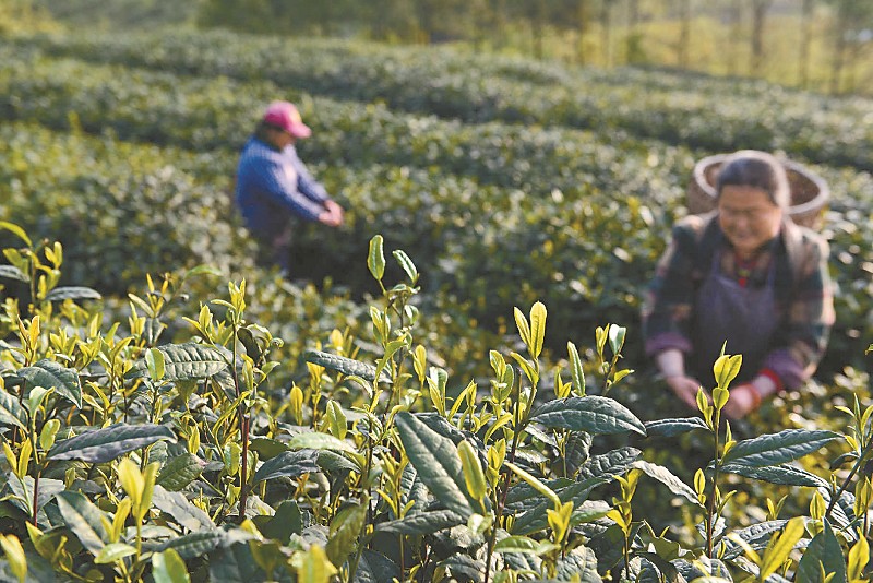 綿竹市土門鎮(zhèn)困牛山水庫趙坡茶園,采茶工在采摘趙坡茶嫩尖