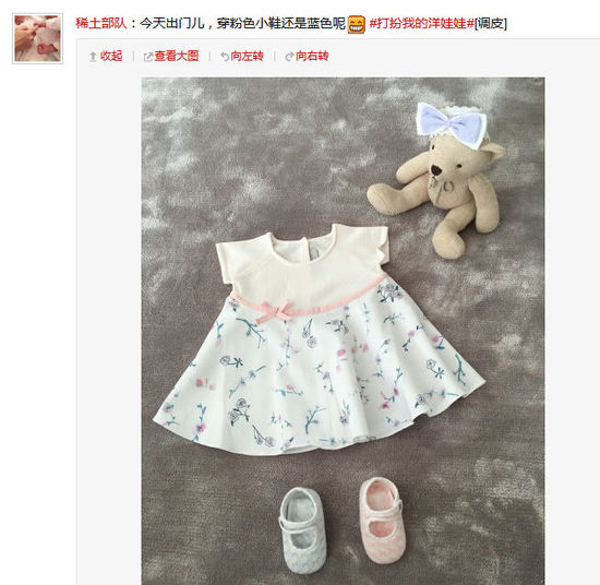 照片中醒醒淡藍色的裙子上點綴著幾朵淡雅的小花,下面粉色小鞋和藍色小鞋各一雙,充滿童趣。