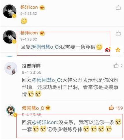 9月5日,楊洋與傅園慧在微博互撩,先是楊洋在李朱濠微博里說:“我需要一條泳褲”,隨后傅園慧回答道:“我可以送你一套,記得多鍛煉身體!”一個是肖奈大神,一個是洪荒少女,兩人隔著萬八千里也不忘撩一下,網友們表示洪荒少女的魅力已經席卷到娛樂圈去啦。