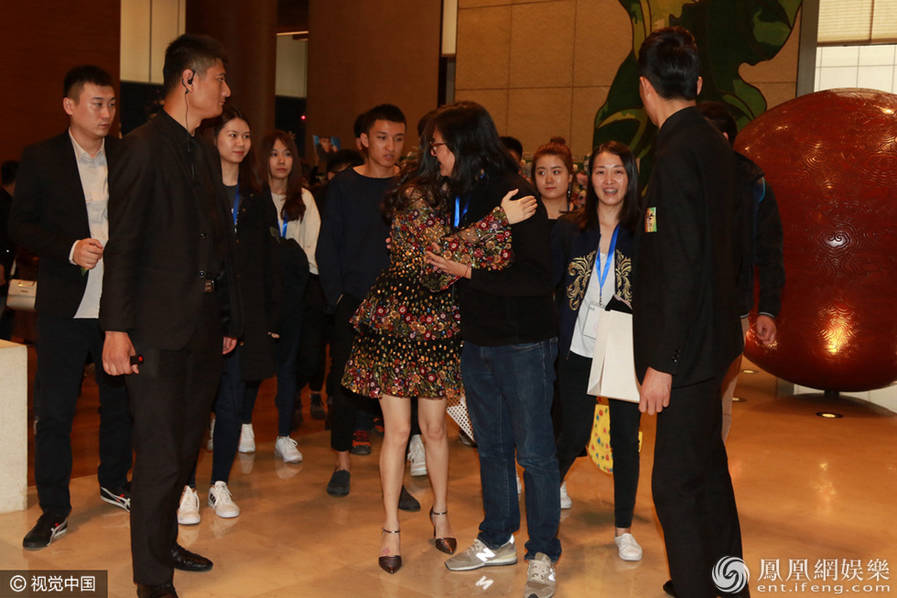 10日,身懷有孕的baby現(xiàn)身北京某會場。離開時,她著寬松裙獲保安開道,挺孕肚不忘秀美腿,與友人熱聊擁抱笑開顏。(圖/視覺中國)